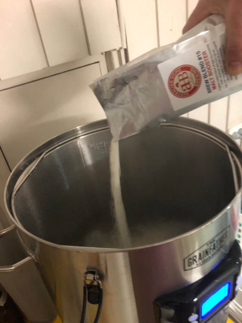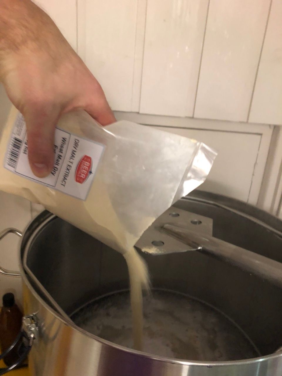 - Slowly add the wheat malt dry extract and Brew Blend #15, stirring continuously (didn't want anything to hit the bottom and burn)