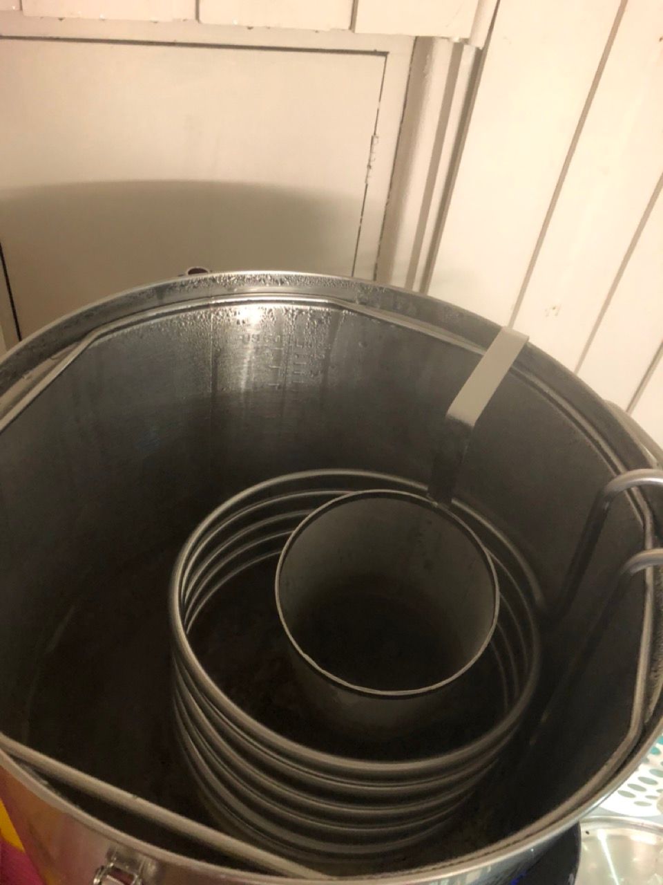 - After 50 minutes, place the immersion chiller and half a Whirlfloc tablet into the boiling wort
