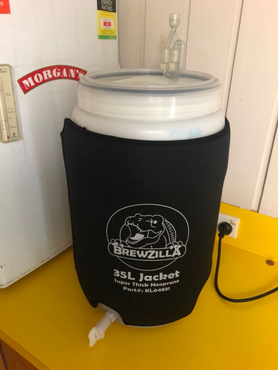 The Bohemian Pilsner was in the fermenting fridge, but that's now been moved into a keg for conditioning. This beer has gone into the fridge to be given a gentle push back to ~18C to squeeze a bit more out of the yeast.