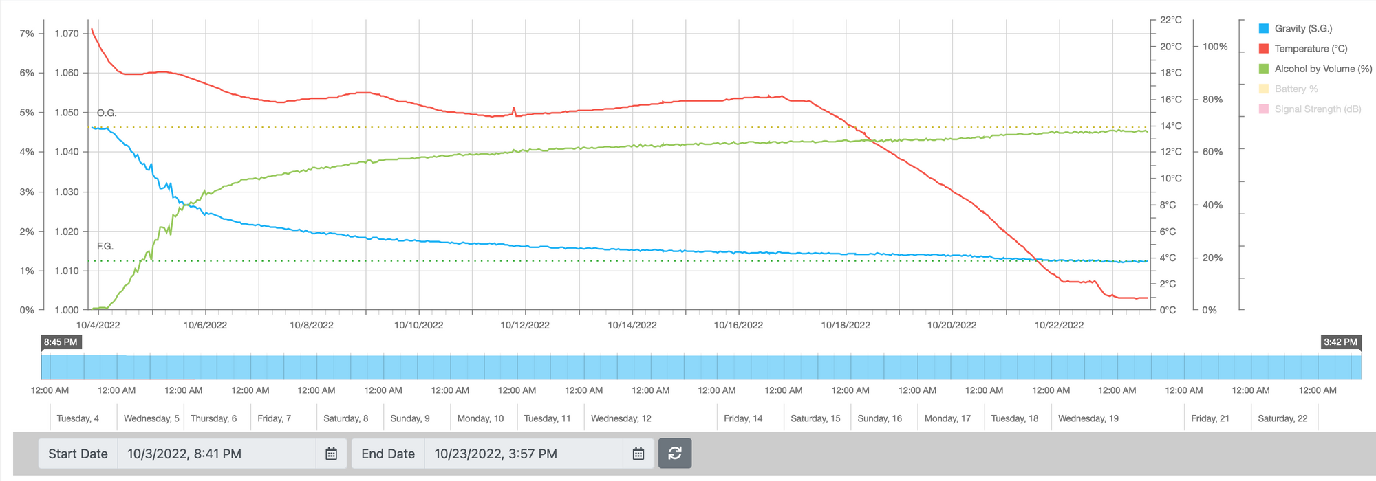 The graph below shows the temperature (red), specific gravity (blue), and ABV (green) reported by the RAPT pill as the fermentation progressed.